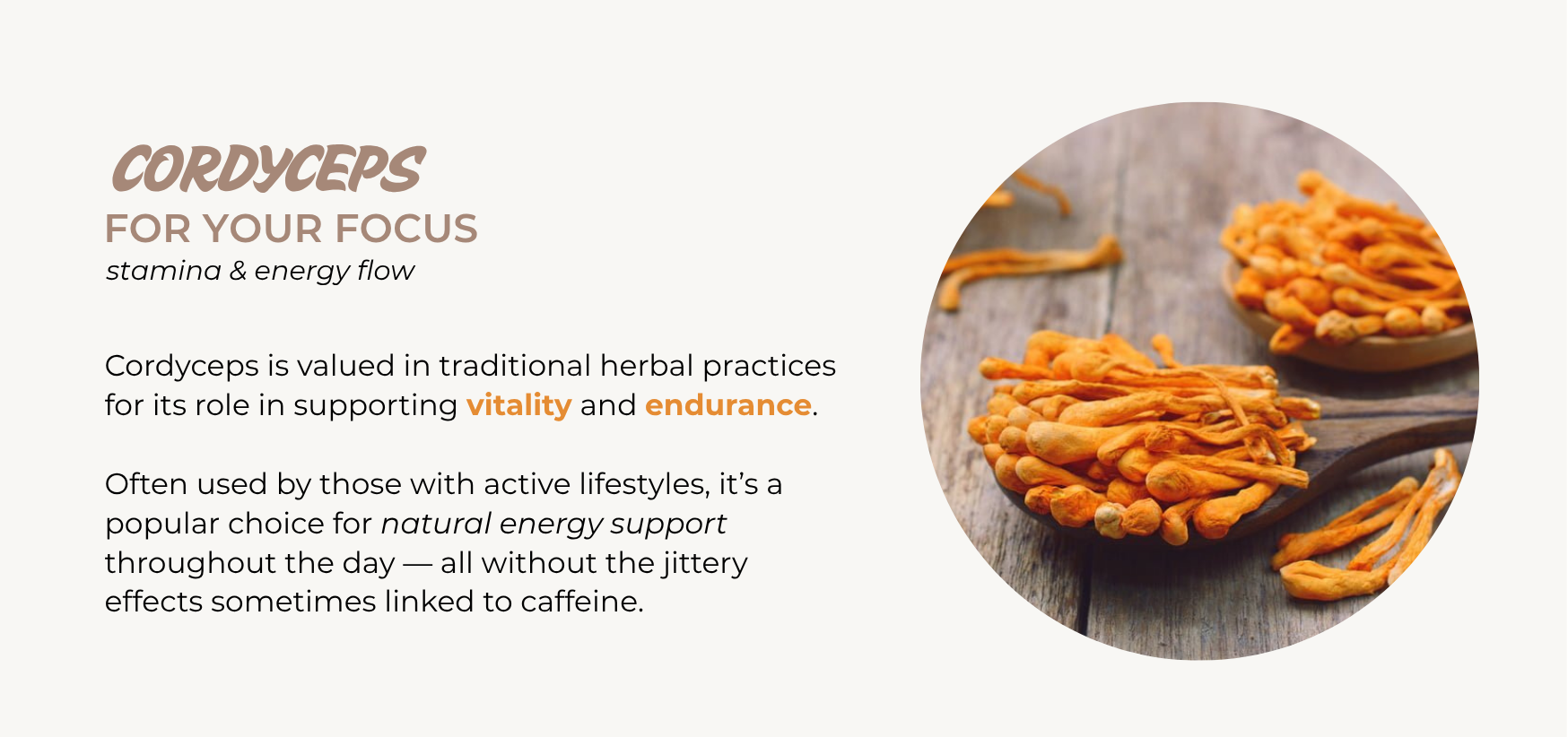 Let’s start with the mushrooms that give you a boost. Known as up-regulators, these functional fungi help increase your energy, focus, and endurance — perfect for days when you want to be at your sharpest.