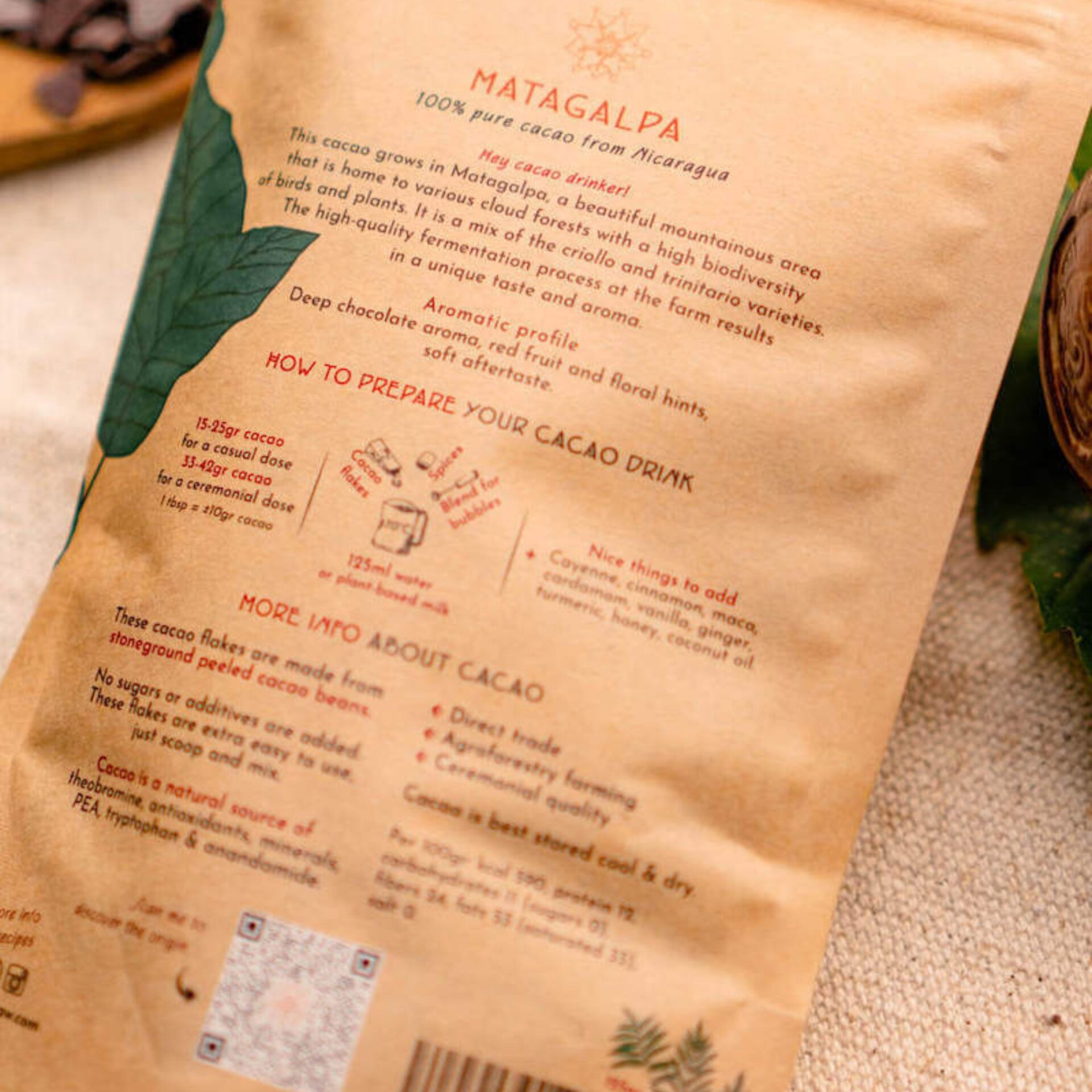 Onze flakes zijn gemaakt van hele cacaobonen die tot een fijne pasta zijn gemalen en lossen daardoor gemakkelijk op in je drankje. In tegenstelling tot cacaoblokken zijn deze flakes extra makkelijk in gebruik: gewoon scheppen en mengen voor een schuimige drank. Dezelfde kwaliteit ceremoniële cacao als een cacaoblok, maar bespaart je het gedoe van het snijden in kleine stukjes en bespaart je de rommel. Bewaar ze naast je koffie en thee thuis of op het werk om van te genieten als onderdeel van je dagelijkse routine.